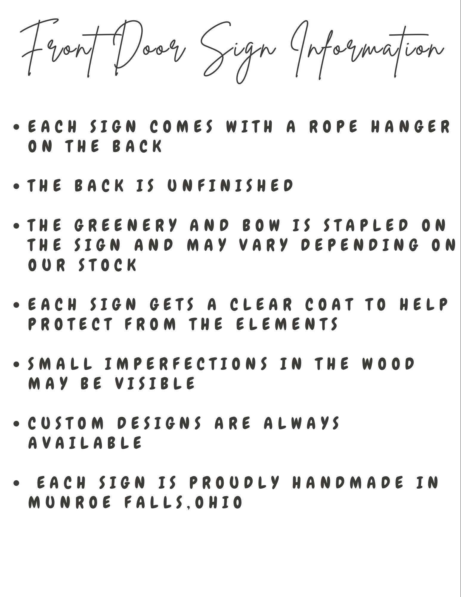 These premium door signs are made out of birch wood and painted by hand. Each one comes with a twine hanger on the back to hang it easily on your door. It also is sprayed to help protect them from the elements. All door hangers are to be used under a covered porch out of the direct elements. Contact us for any other questions or custom designs!
